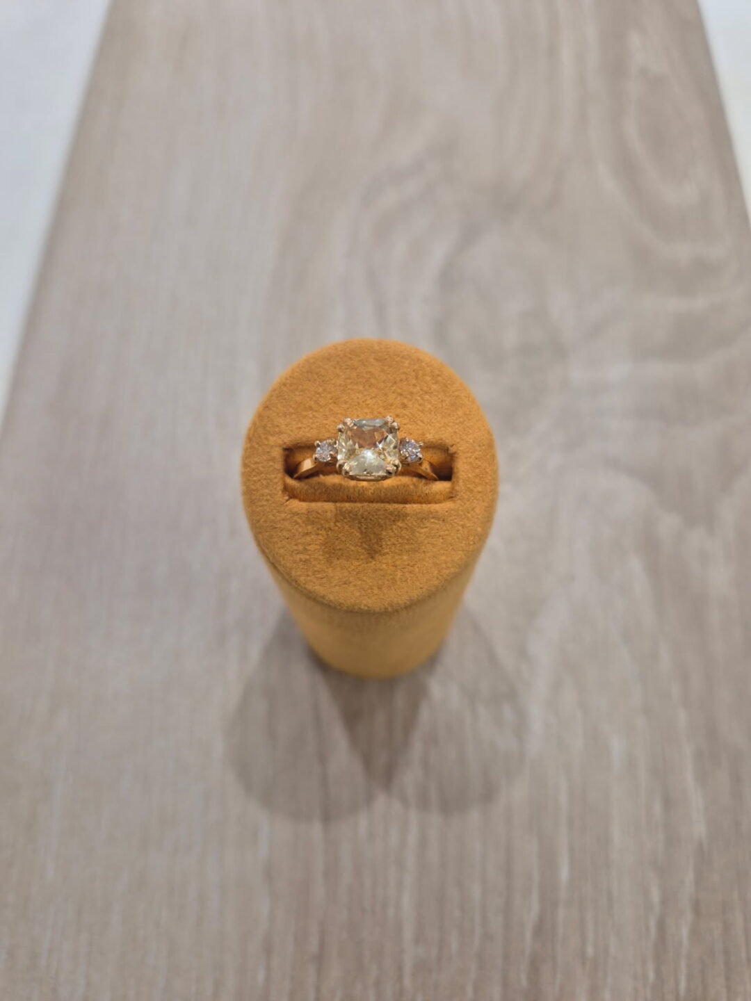 Fabrication d’une bague trilogie or rouge 750mm serti au centre sur 1 chaton central double griffes d’un saphir jaune octogonale naturel de 2.08carats certifié LGL N°2109032211 et de chaque coté d’un diamant naturel.