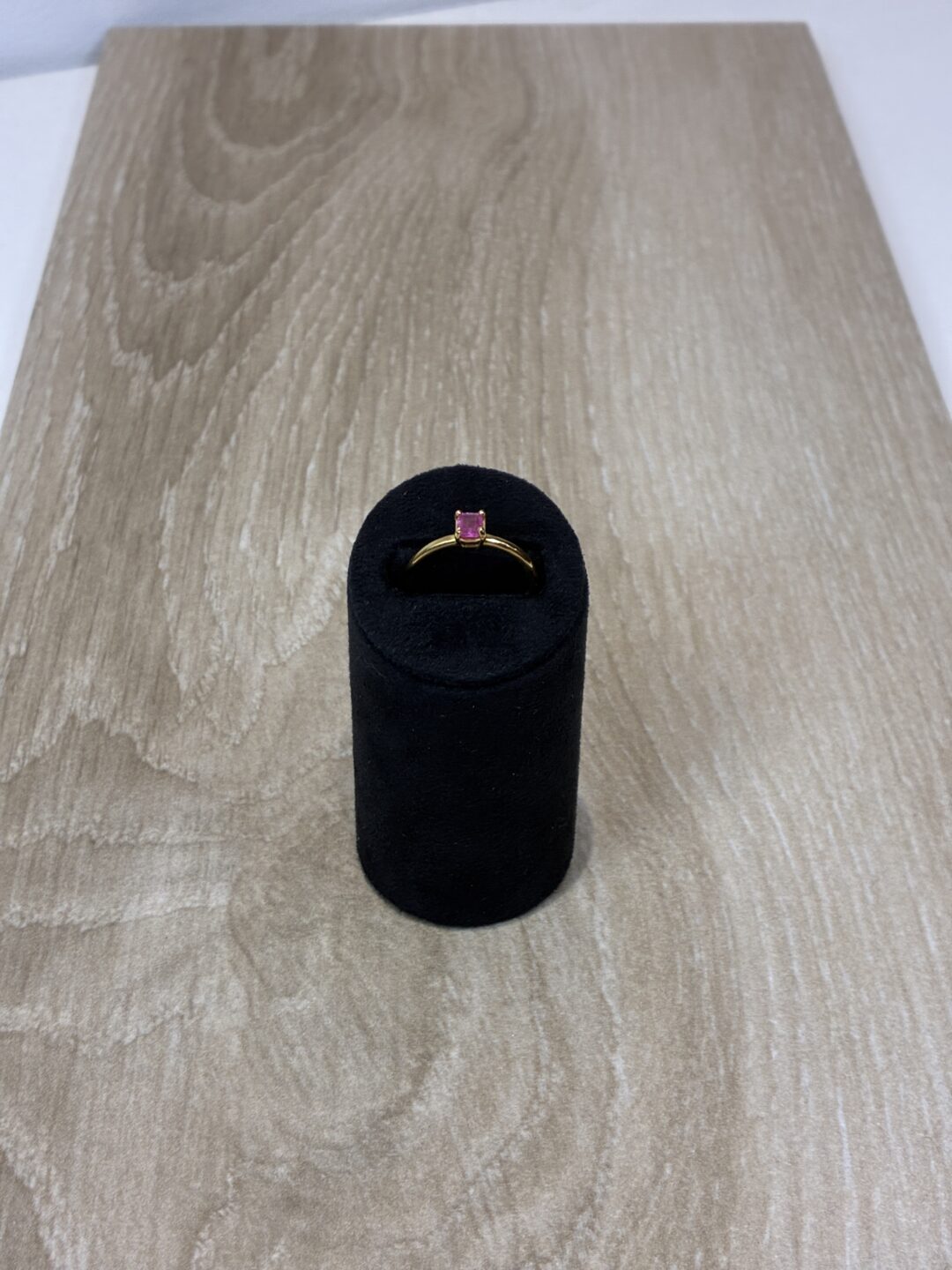 Fabrication d’un solitaire or blanc 750mm serti au centre sur un chaton rectangle 4 griffes d’un saphir rose taille émeraude de 0,47 carats et monté sur un corps fil rond.